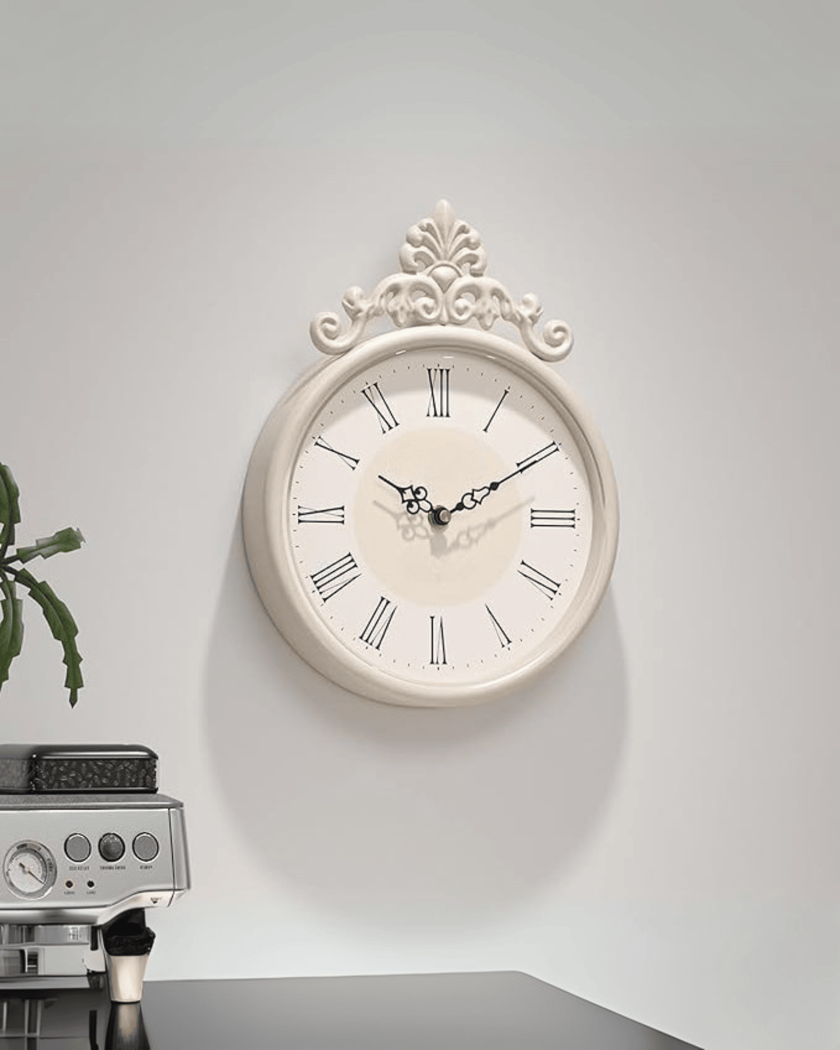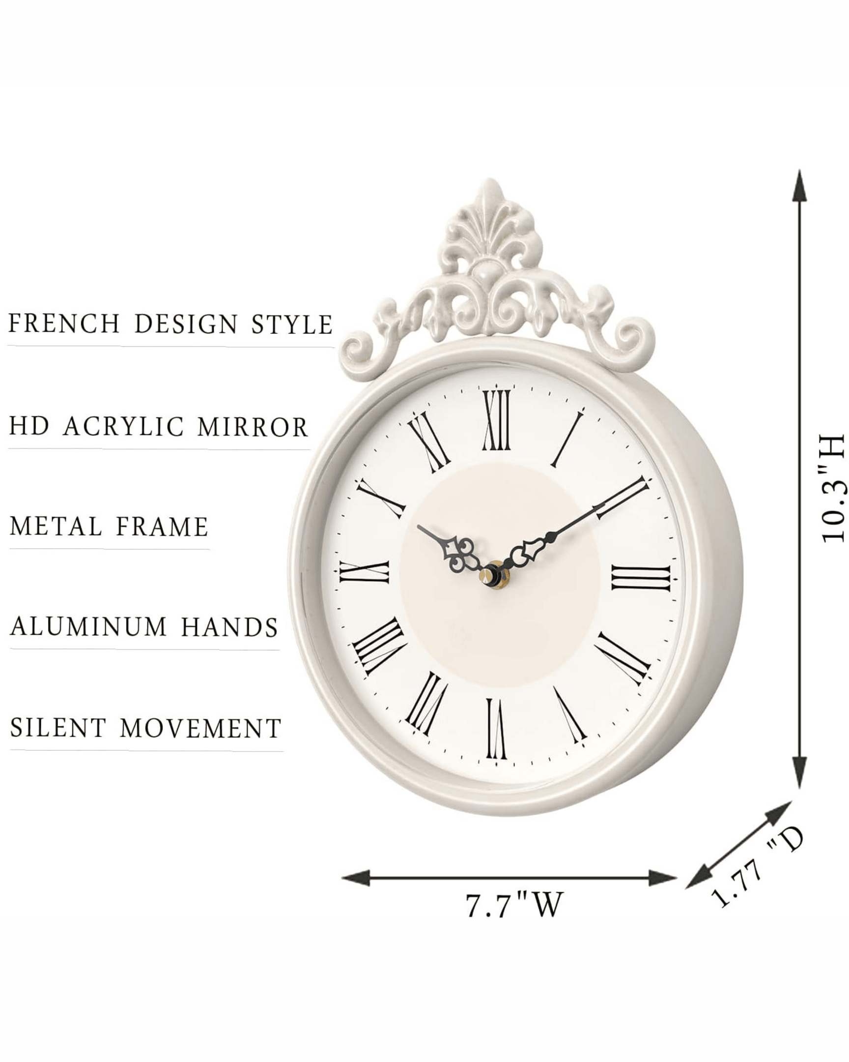 - Timeless French Design: Inspired by classic vintage French style, this elegant wall clock features a beautiful, ornate crest at the top, adding a decorative flourish that evokes a sense of antique charm and luxury. The large Roman numerals are easy to read from a distance, while the delicate hands add a touch of sophistication to its design.