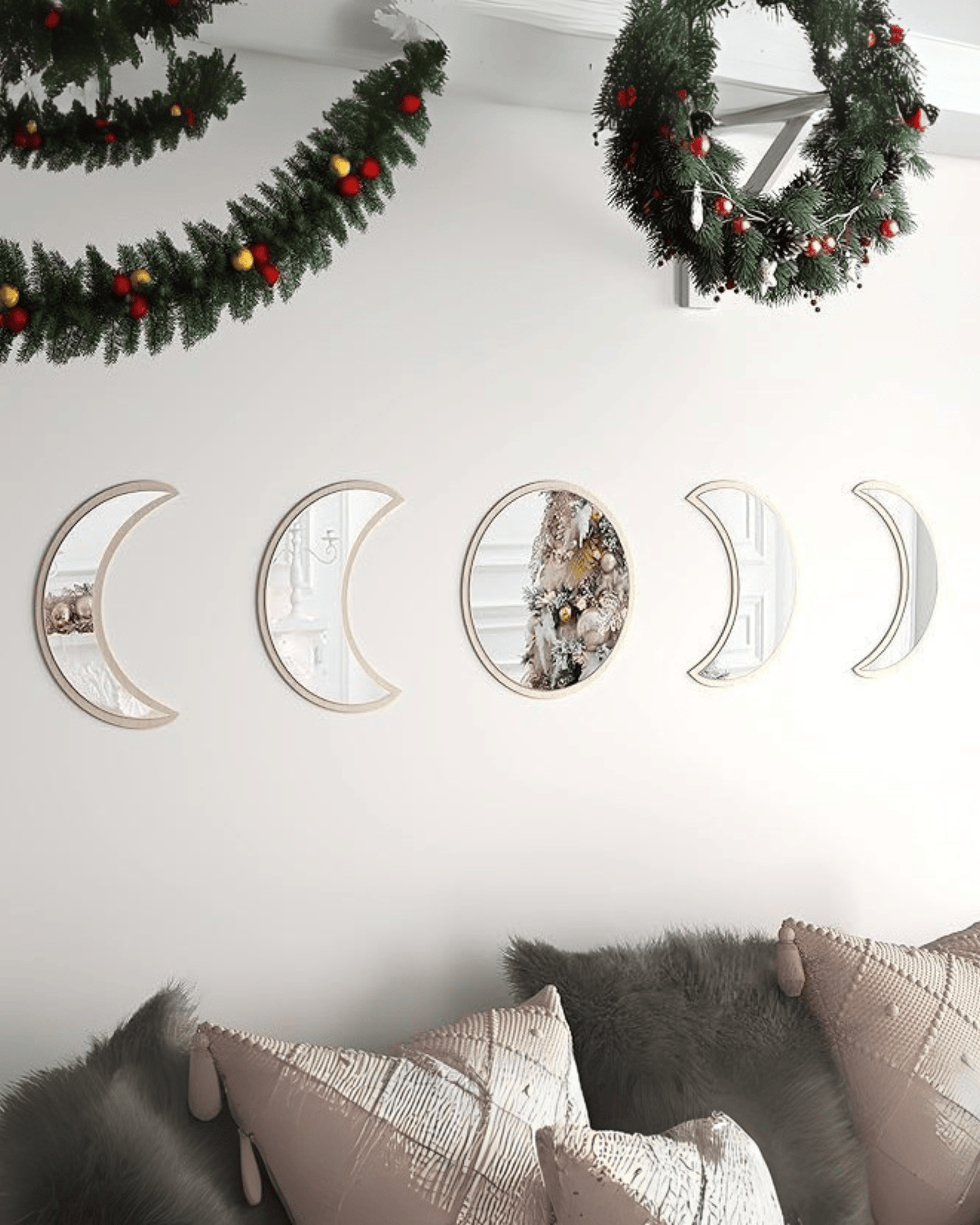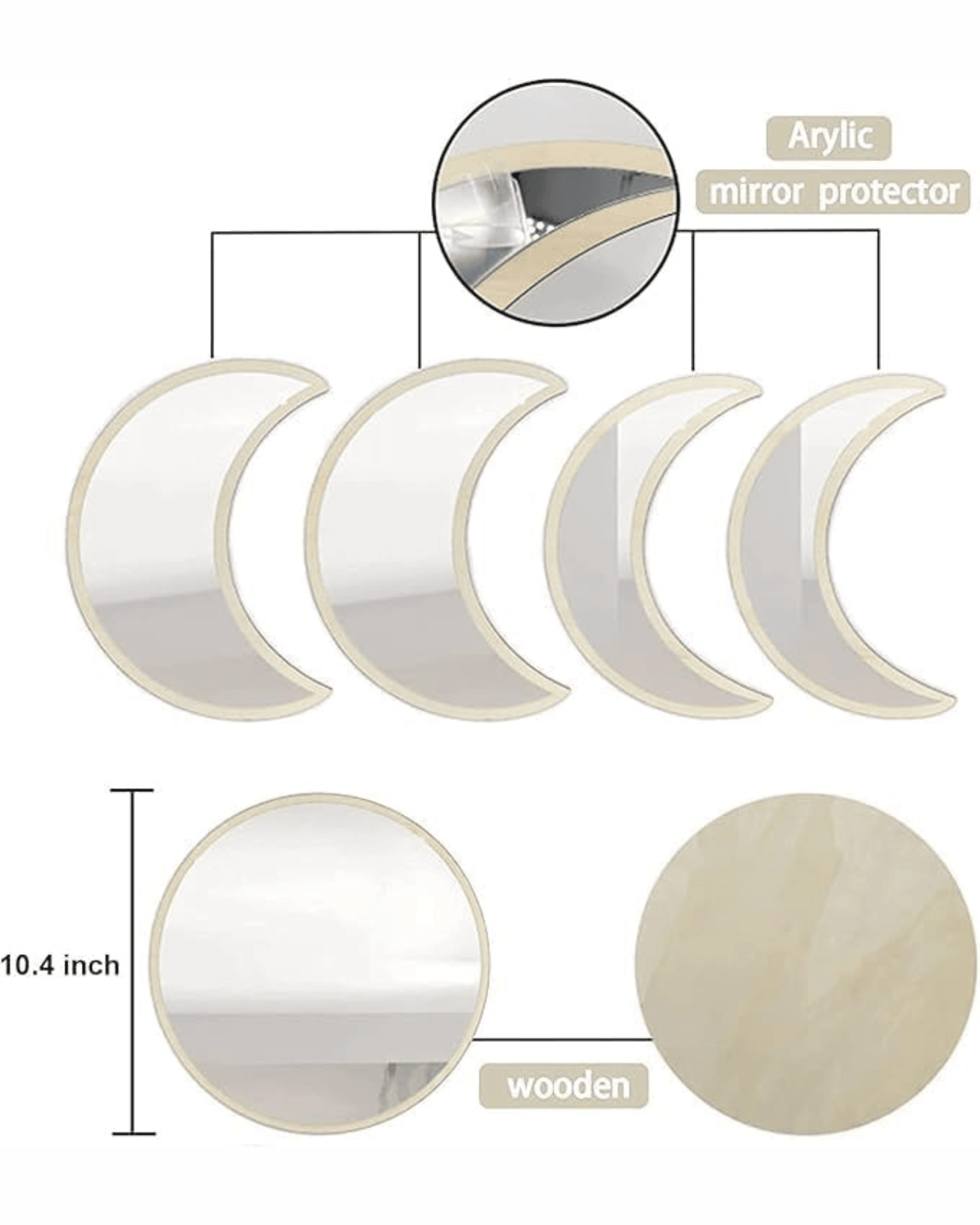 - Unique Moon Phase Design: This set features a beautiful collection of five mirrors, arranged to depict the phases of the moon. The central round mirror is surrounded by four crescent-shaped mirrors, creating a stunning and artistic display that adds a dreamy, celestial touch to any wall.